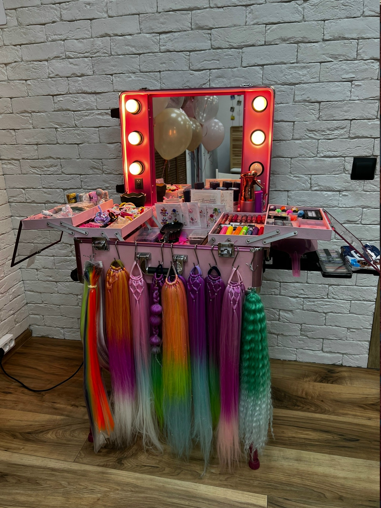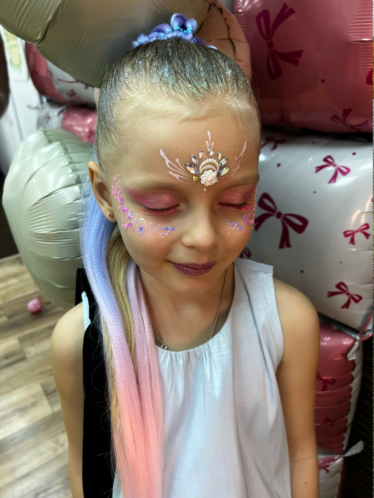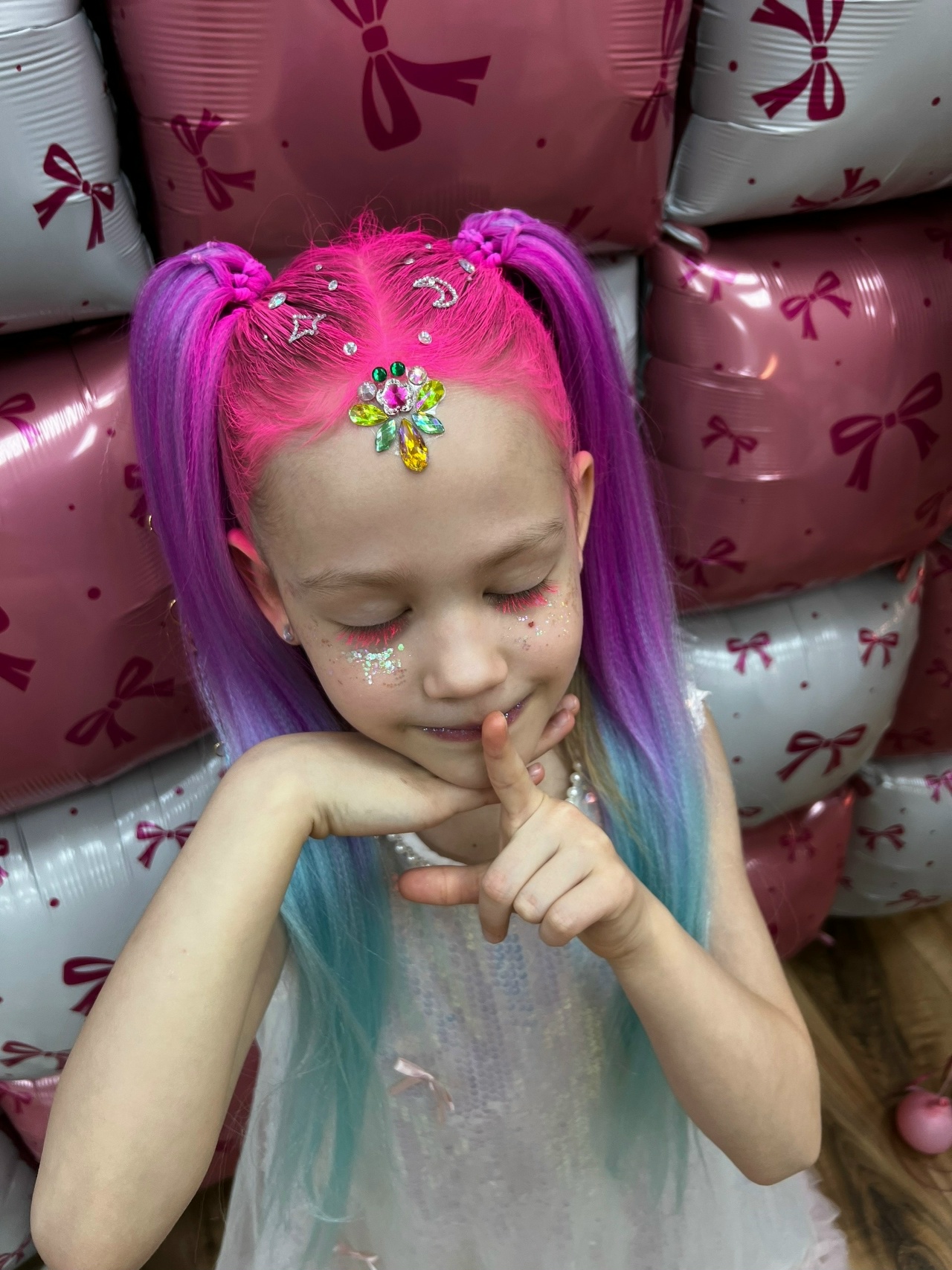 Бьюти-бар с блестящими стразами, яркими блестками и цветными прядями— то, о чем мечтает каждая девчонка! Почувствуй себя настоящей звездой с неповторимым образом, и не забудь сделать крутые фотографии!