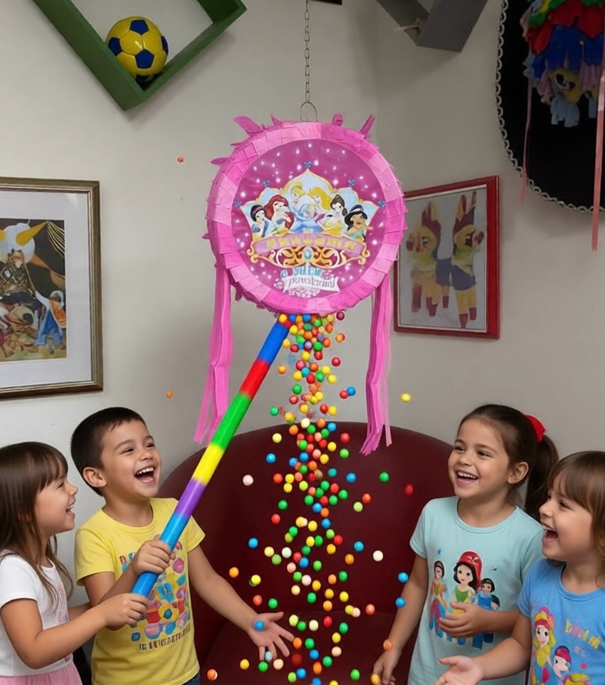 Пиньята — веселое развлечение для детей любого возраста! Конструкция, наполненная сладкими конфетами и сюрпризами, которые ребята с радостью разбивают и делятся друг с другом!